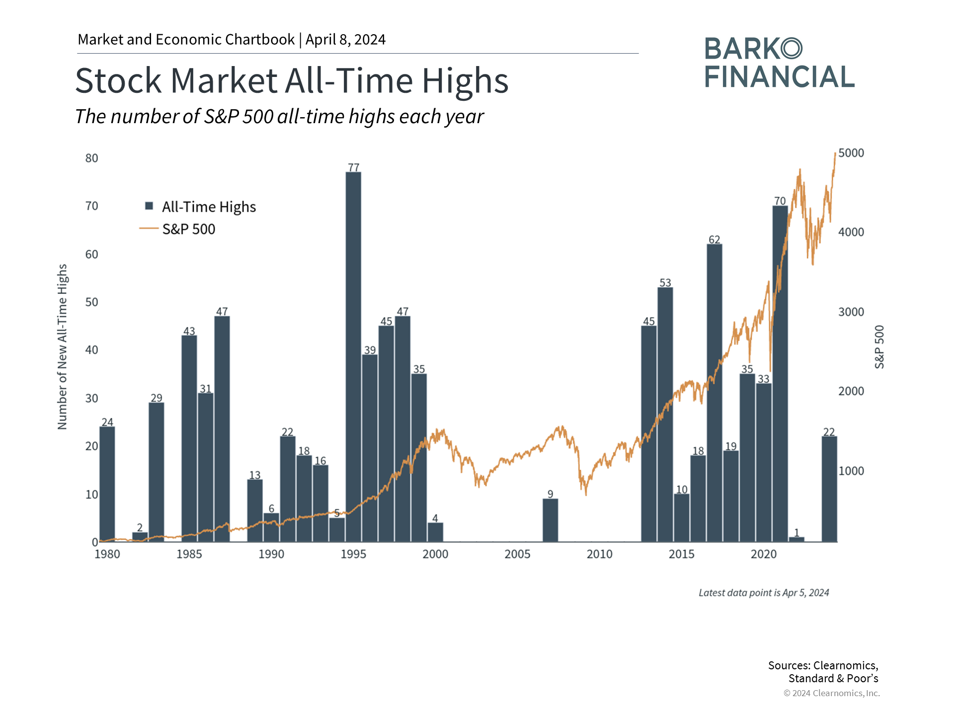 The S&P 500 has achieved 20 new all-time highs so far this year despite the brief market pullback during the first two weeks of the year. While this is positive for investors, it is easy to worry that continued market growth may not be sustainable. Do new all-time highs mean that the market is due for a pullback? While price swings are an unavoidable part of investing, and the market does experience pullbacks from time to time, history shows that markets also tend to rise over long periods. During a bull market cycle, major stock market indices will naturally spend a significant amount of time near record levels, as shown in the accompanying chart. For instance, 2021 experienced 70 days with the market closing at new all-time highs, adding to the hundreds that were achieved since 2013. Taking a long-term perspective allows investors to benefit from these market trends without constantly worrying about when a pullback might occur. Holding an appropriately diversified portfolio can help investors to withstand market pullbacks without focusing too much on the exact level of the market. 2. Markets have rallied through both Democratic and Republican presidencies