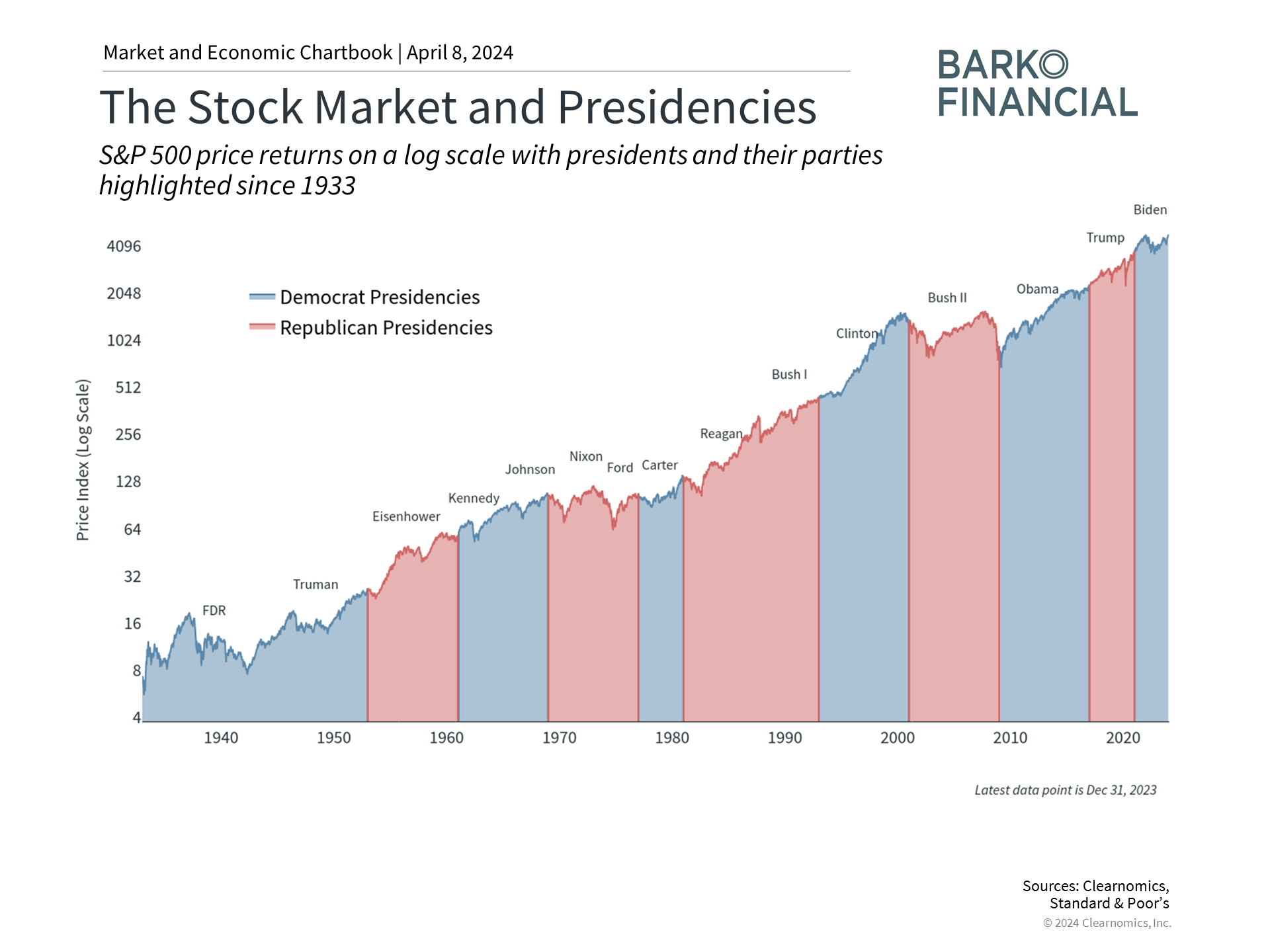 Coverage of the presidential election is heating up ahead of the November rematch between Presidents Biden and Trump. While elections are an important way for Americans to help shape the direction of the country as citizens, voters and taxpayers, it’s important to vote at the ballot box and not with investment portfolios. This is because history shows that markets can perform well under both Democrats and Republicans. As the accompanying chart shows, the economy and stock market have grown over decades regardless of who was in the White House. What mattered more across these periods were the ups and downs of the business cycle. The Clinton years, for instance, benefited greatly from the long expansion of the 1990s. The George W. Bush years, on the other hand, overlapped with both the dot-com crash and the 2008 global financial crisis. Business and market cycles defined their presidencies, and not the other way around. Of course, politics can impact taxes, trade, industrial activity, regulations, and more. However, not only do these policy changes tend to be incremental, but also the exact timing and effects are often overestimated. Thus, it’s important to focus less on day-to-day election poll results and more on the long-term economic and market trends. Ideally, investors concerned about the impact of specific policies on their financial plans should speak with a trusted financial advisor. 3. The Fed is expected to cut rates as inflation stabilizes