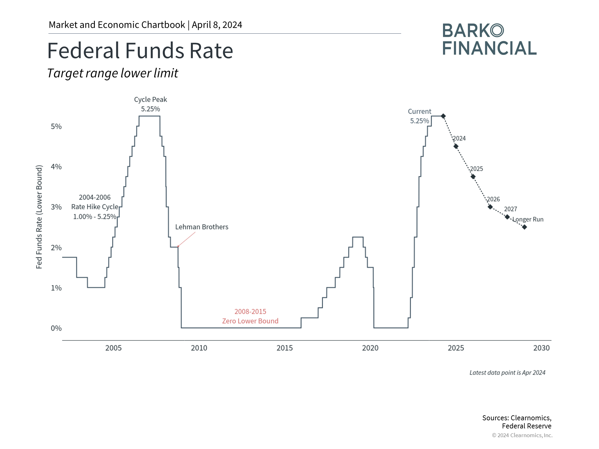 The market rally broadened beyond mega-cap technology stocks in the first quarter. The equal weight S&P 500, an alternative to the standard market cap-weighted index, hit a new all-time high in early March, a sign that a wider range of stocks is performing well. The positive economic outlook and the possibility of rate cuts have boosted optimism across many parts of the market. Given this backdrop, the Fed is expected to cut rates later this year although the timing remains uncertain. The accompanying chart shows the possible path of the federal funds rate based on the Fed’s latest projections, including three cuts this year. At its last meeting, the Fed cited strong job gains and low unemployment as indicators of solid economic activity but emphasized that “the Committee does not expect it will be appropriate to reduce [interest rates] until it has gained greater confidence that inflation is moving sustainably toward 2 percent.” Regardless of the exact timing and path of Fed rate cuts, these projections represent a reversal of the emergency monetary policy actions that began in early 2022. For investors, it’s important to adapt to this changing environment and not focus solely on the events of the past few years. The bottom line? With markets near all-time highs, a presidential election approaching, and Fed rate cuts expected to begin later this year, investors should stick to their financial plans while staying invested in the second quarter of the year. History shows that this is still the best way to achieve long-term financial goals. | |||