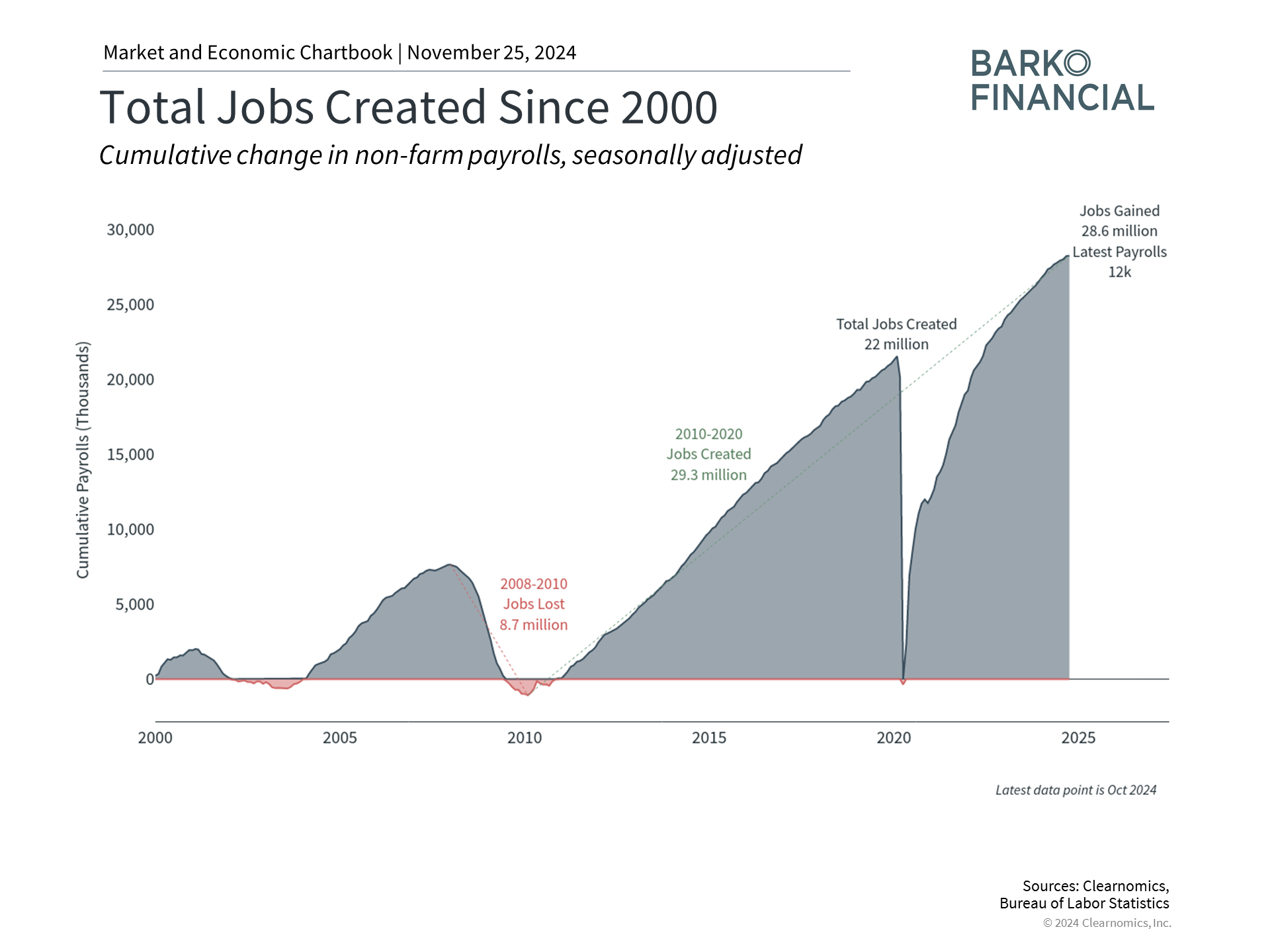 Unemployment remains near historic lows with steady job creation. While wage growth hasn't fully matched inflation, it has been positive. The chart demonstrates remarkable job creation, with 28.6 million new positions added post-pandemic, substantially exceeding previous levels. Despite sectoral variations, this has contributed to overall consumer financial health.