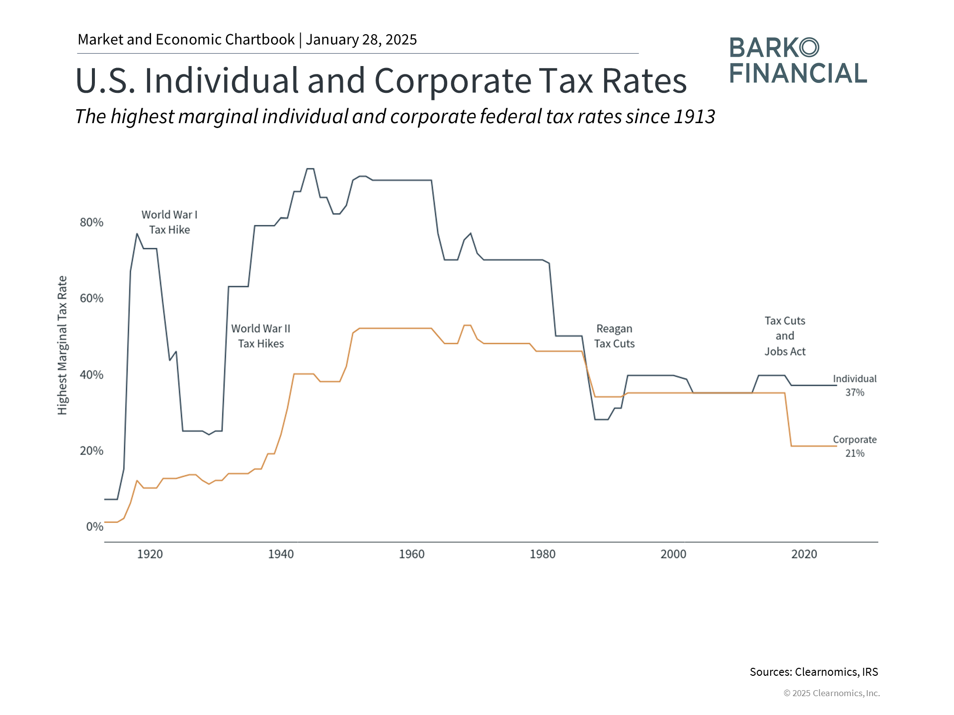 President Trump’s inauguration marks a significant political shift amid market and economic uncertainty. The stock market had rallied as much as 5.3% with dividends in the month following the November election, before giving up about half of those gains at the start of the year.1 As President Trump begins his second term, both Wall Street and Main Street are wondering what the next four years may bring. Investors face a complex environment in 2025 with steady economic growth balanced against fewer Fed rate cuts and high valuations. This is one reason investors could be more sensitive to growth policies than in the past. So, while the president has already signed dozens of executive orders, many of the new administration’s policy details are still uncertain and much could change in the coming weeks. However, key areas will certainly include taxes, fiscal spending, trade, energy, and immigration – all of which could impact the economy. Below, we explore seven areas that could affect investors: 1. The Tax Cuts and Jobs Act will likely be extended