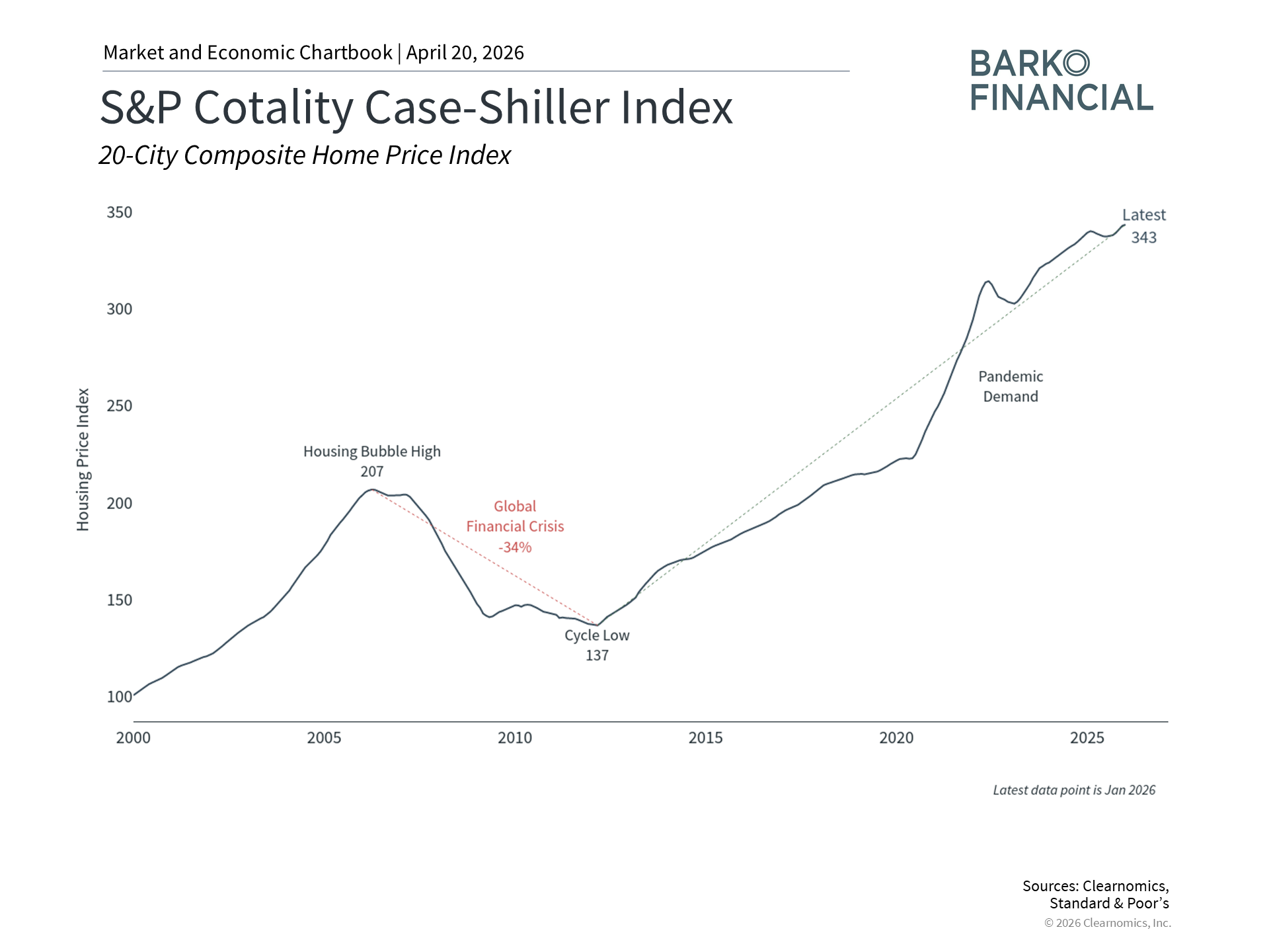 Housing activity has been mixed in recent years across a number of measures. For new buyers, the biggest challenge with affordability is mortgage rates. The 30-year fixed mortgage rate is around 6.3%, well above the lows of 3% or less in 2020 and 2021, and the average of 4.6% since 2008. This means that the monthly cost of purchasing a home is significantly higher than it was just a few years ago, even for buyers with substantial down payments. For those homeowners who were able to lock in mortgage rates near historic lows over the past decade, it can be a difficult decision to sell and give up these rates. This has kept the supply of existing homes limited, leading to a tighter housing market. In March, the sales volume of existing homes fell 3.6%, a reversal to its low one year ago, after climbing earlier this year. In reaction to this, new construction has increased, with housing starts accelerating to 1.5 million units per year in January, but it will take time for this to ease pressure on prices. Even among homebuilders, however, the outlook remains uncertain. The NAHB/Wells Fargo Housing Market Index, which measures sentiment among homebuilders, fell from 38 to 34 in April. From a stock market perspective, the homebuilding subindustry within the S&P 500 index has been roughly flat on the year with a gain of only 0.4%, after several years of mixed performance. Despite these challenges with housing activity, home prices are still near record levels across the country. The S&P Cotality Case-Shiller indices, which measure prices nationally and across the largest U.S. cities, have climbed steadily. Across the country, home prices have experienced significant declines in only two periods in recent history: the 2008 housing bust and the brief pullback that followed the rapid rise in inflation beginning in 2022. Higher home prices mean that, from a macroeconomic perspective, balance sheets for homeowners have generally remained healthy. This has been further supported by a low unemployment rate and strong wage gains, and are important reasons that overall consumer spending has held up better than many feared. These factors have helped to offset poor consumer sentiment driven by inflation and job losses in certain sectors, such as in tech. Housing is often the foundation of wealth across generations