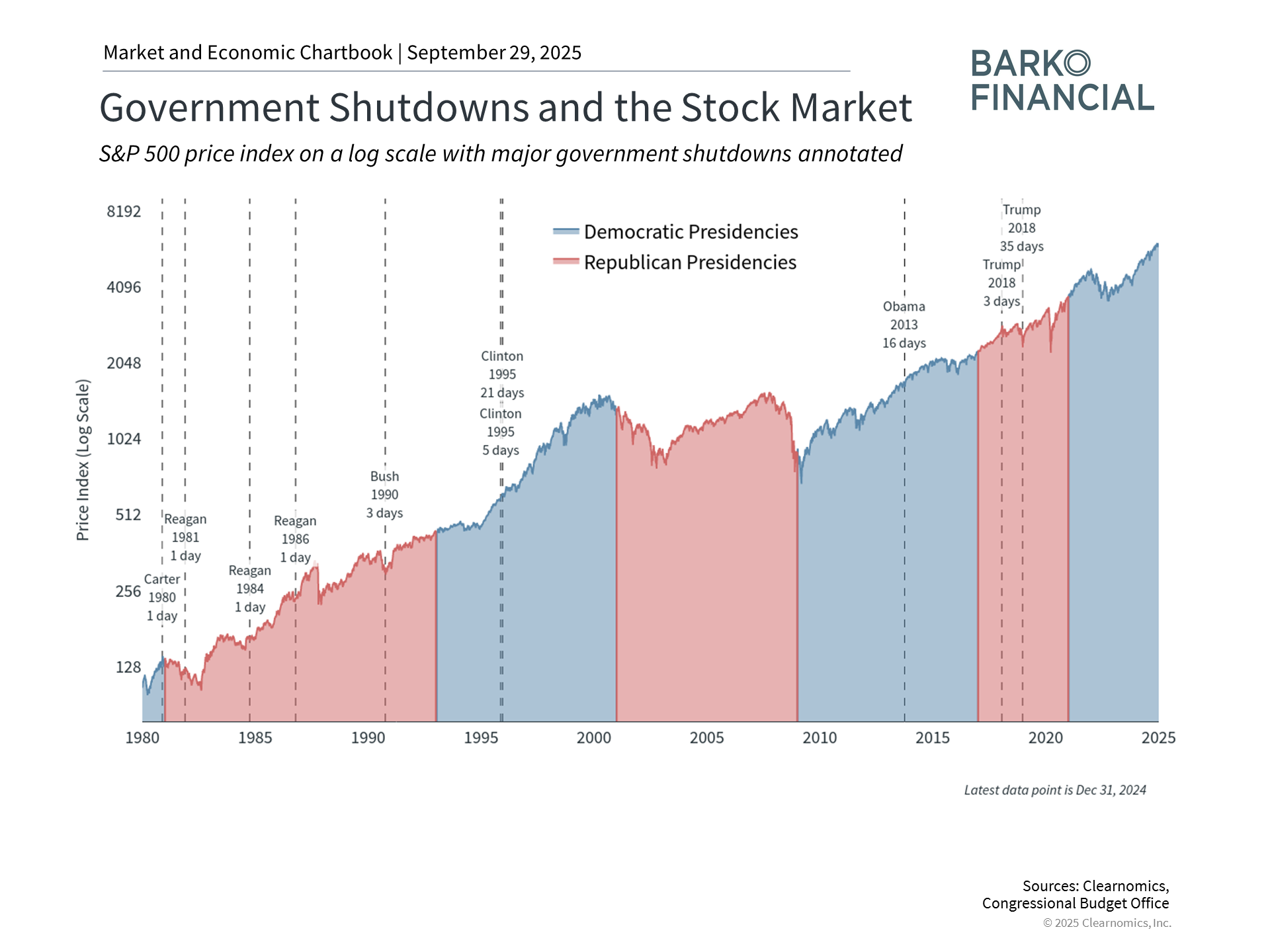 As the accompanying chart shows, government shutdowns have occurred regularly since 1980 under presidents of both parties, with minimal long-term impact on financial markets. The chart illustrates that this was true even during the most contentious shutdowns, including during the Reagan administration, Clinton's 21-day shutdown in 1995, Obama's 16-day shutdown in 2013, and Trump's 35-day shutdown in late 2018 to early 2019 - the longest on record. For investors, shutdowns have generally served as temporary disruptions rather than fundamental threats to economic growth.