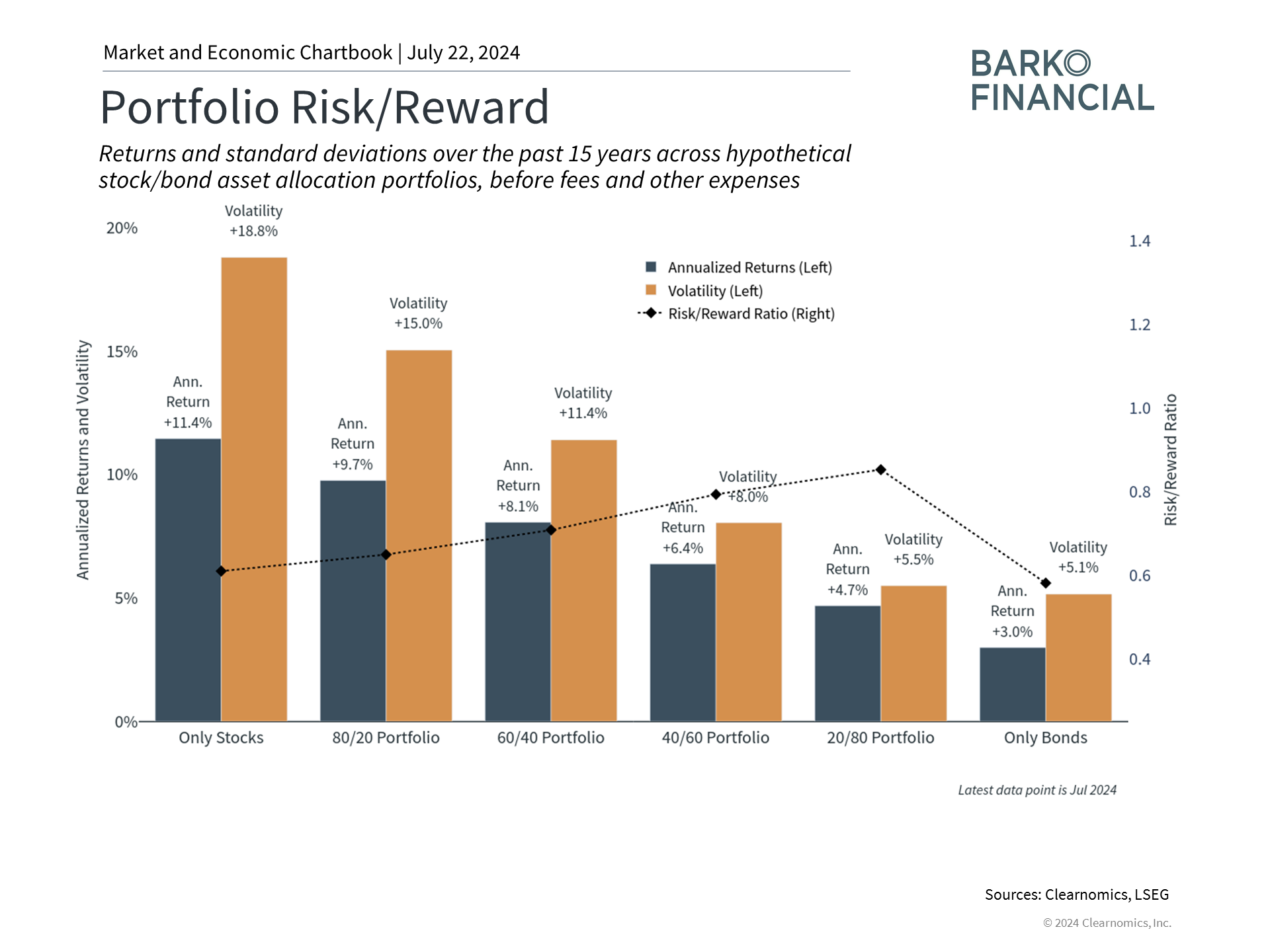 For example, stocks tend to generate larger returns but are also much riskier, as shown in the accompanying chart. In contrast, bonds are typically more stable but also have less potential upside. An appropriate asset allocation allows investors to take advantage of the positive attributes of both asset classes to create a portfolio that is more than the sum of its parts. Investors can then adjust this asset allocation throughout the various stages of their lives and as they approach retirement, in addition to making tactical and strategic shifts based on market conditions.
