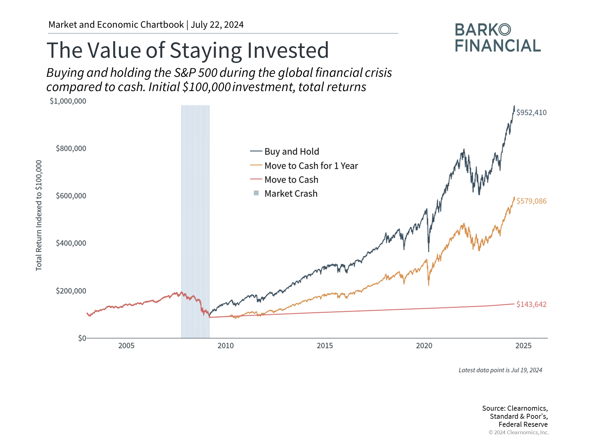From President Biden’s announcement that he will not be seeking re-election, to a rotation out of tech stocks and into small caps, recent events have added to market uncertainty. The S&P 500 recently declined 2.9% from its all-time high, while the Nasdaq pulled back nearly 5%.1 It’s natural for investors to be concerned about where the market is headed, especially as the presidential election season heats up and the Fed prepares for its first rate cut this cycle. However, history shows that it’s important for investors to stay focused on the long run and not overreact to every news headline. More than ever, staying levelheaded is the best way to achieve long-term financial goals.