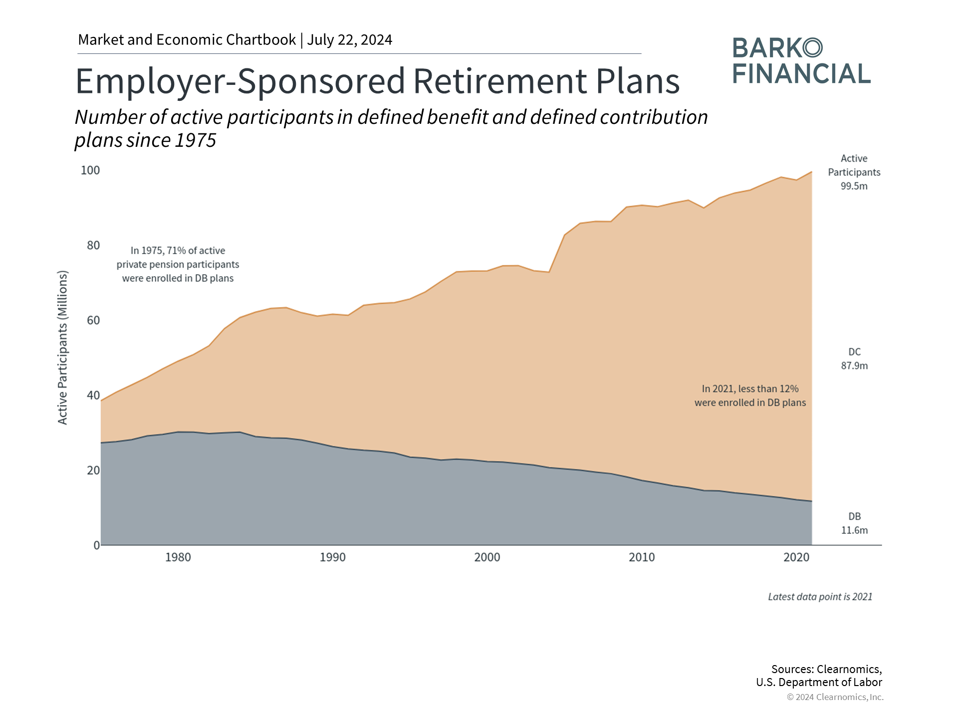 How has the retirement landscape shifted? Looking back, the American Express Company (a railroad business at the time) introduced the first pension plan in 1875. This kicked off a trend of employers providing benefits for employees in retirement. For much of the next century, these were largely “defined benefit” plans, meaning employers contributed to a shared fund and eligible employees would receive benefits in a set amount once they became eligible. Defined benefit plan participants would have the assurance that if they met the qualifications, they would be able to count on regular paychecks in retirement.