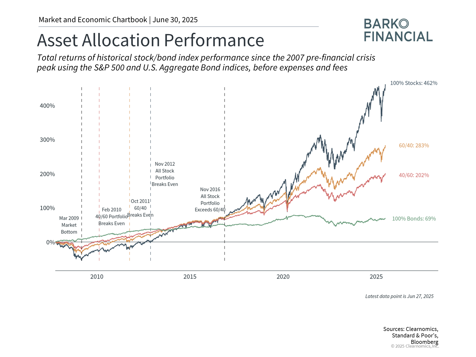 Those portfolios that are heavily invested in stocks may outperform when the market is expanding, but will also typically experience larger swings during downturns. Including bonds can make the ride smoother, which likely helps to ensure that financial goals are met. Which path makes the most sense depends on your particular risk tolerance and return objectives. Having a comprehensive view of your goals and financial needs allows you to tailor a portfolio to withstand the next period of volatility, when it inevitably occurs.