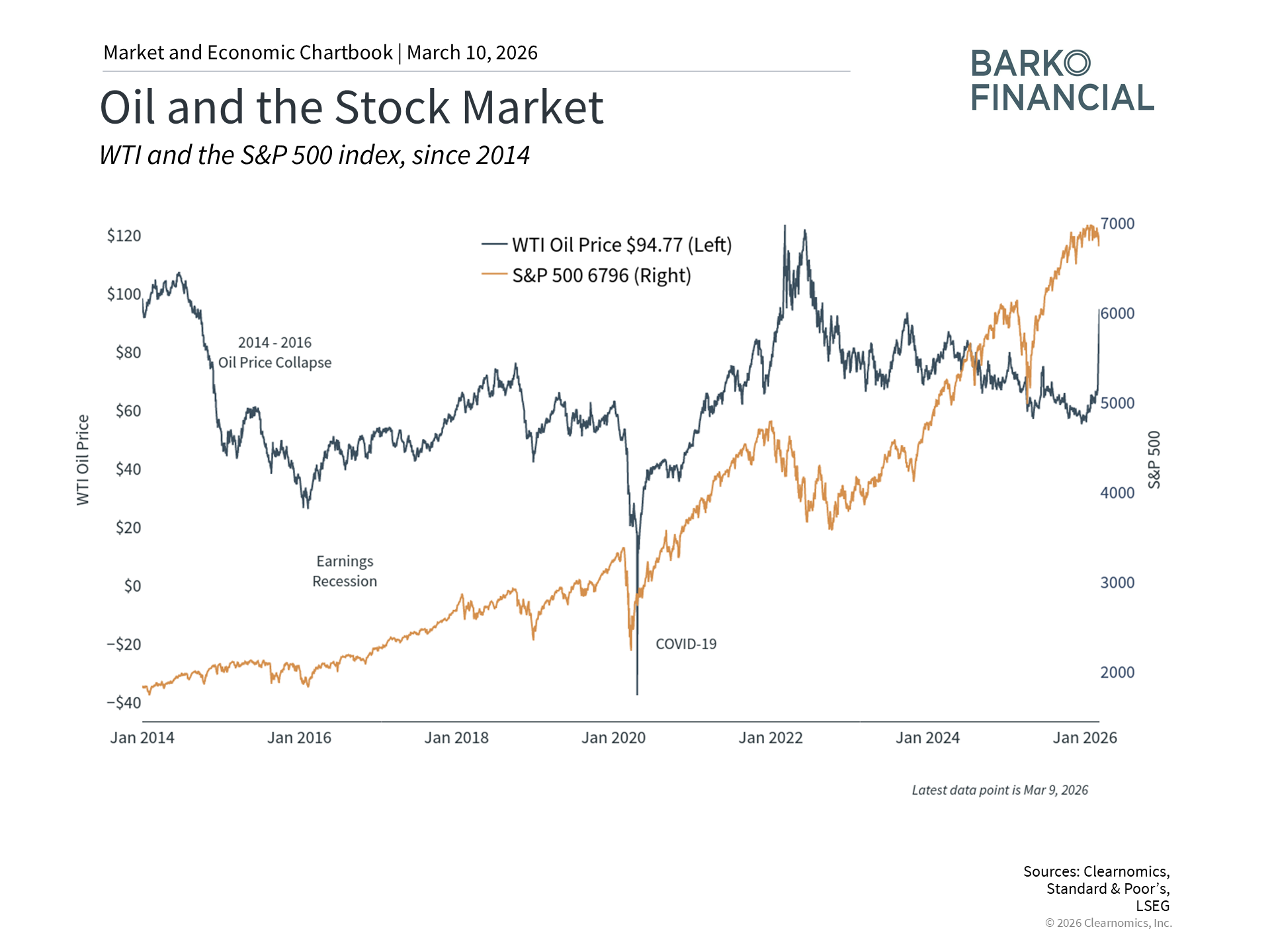 Despite these historical lessons, the reality is that financial markets can react to oil price shocks in the short run. The S&P 500 is only down a couple of percentage points year-to-date, but many headlines are highlighting the South Korean KOSPI index’s decline of 17%, Japan’s Nikkei index’s 10% fall, and others since the end of February. What they don’t emphasize is that the KOSPI and Nikkei are still up over 104% and 40%, respectively, over the past year, even with these recent declines. Markets never move up in a straight line, so it’s important to maintain this broader perspective.