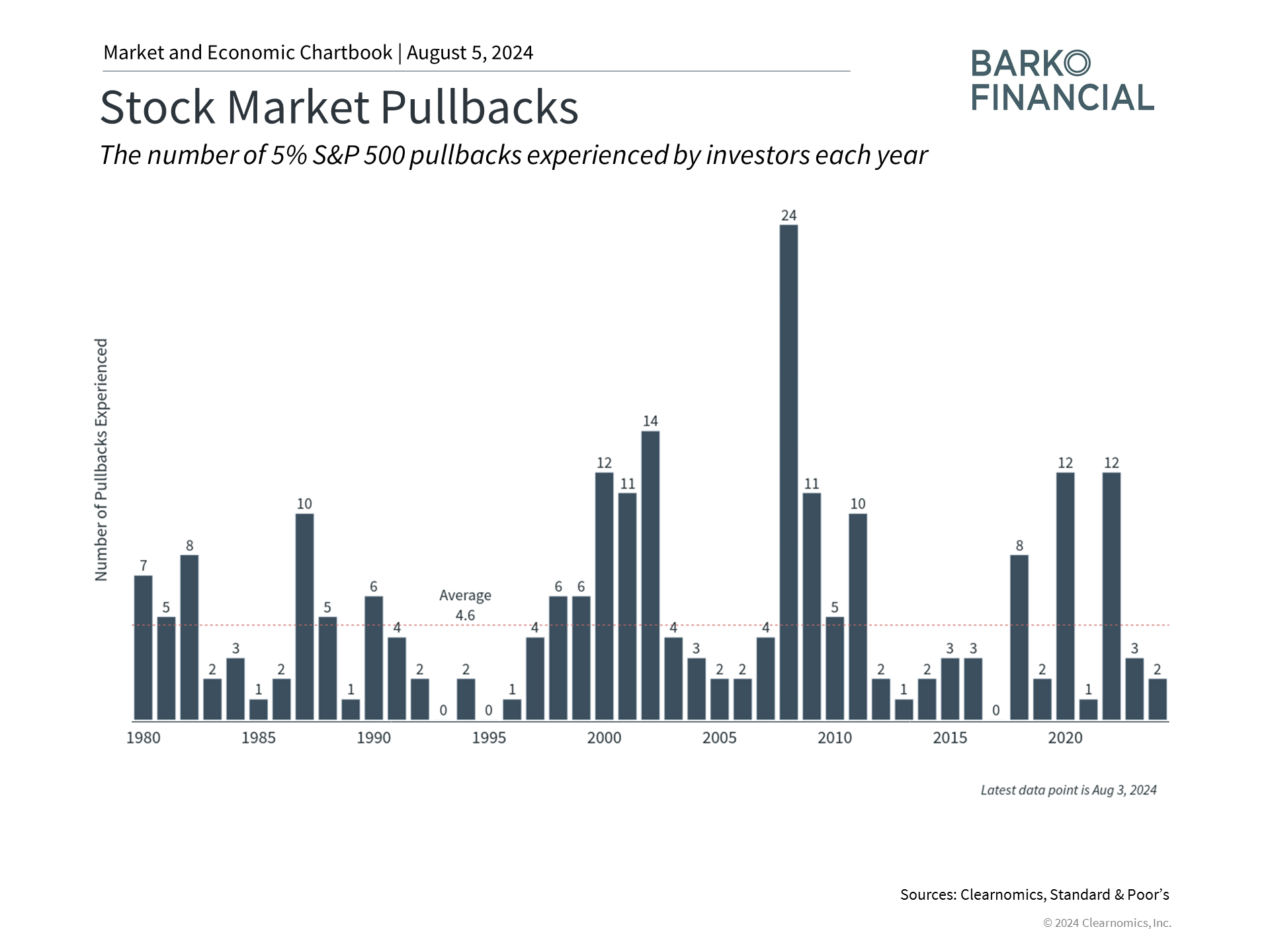 Stocks never move up in a straight line, so how we react to market volatility is perhaps more important than the volatility itself. The S&P 500 has now experienced its second 5% or worse pullback this year. As the accompanying chart shows, this is below the average of 4 to 5 pullbacks experienced in the average year, and the dozens during bear markets.
