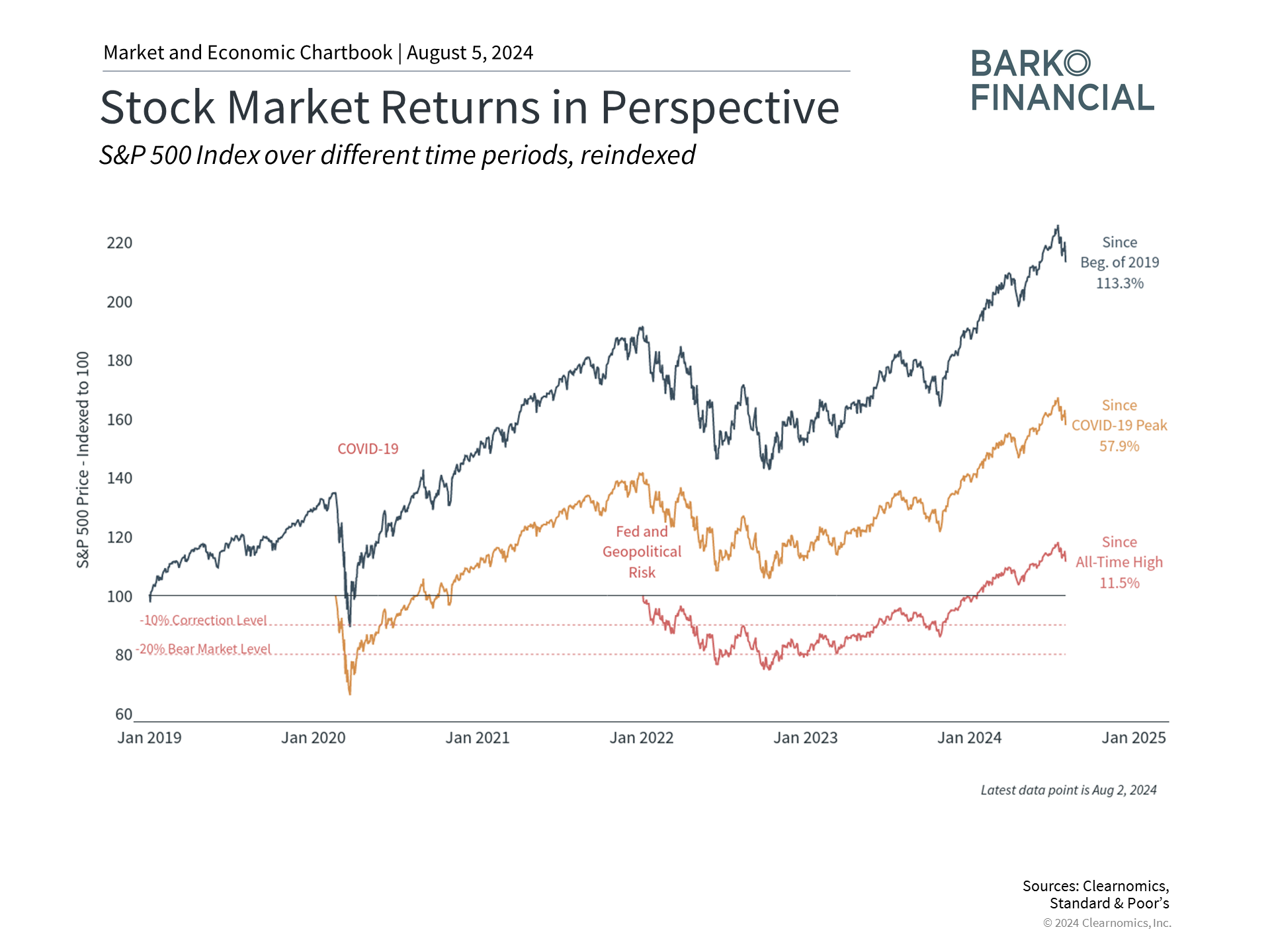 Ironically, current macroeconomic conditions – inflation returning to 2%, low but rising unemployment, falling interest rates, and double-digit stock market gains – are exactly what investors had hoped for at the start of the year. Now more than ever, investors need perspective to navigate markets and stay on track to achieve their financial goals. How should investors view recent stock market swings as they position for the coming months?