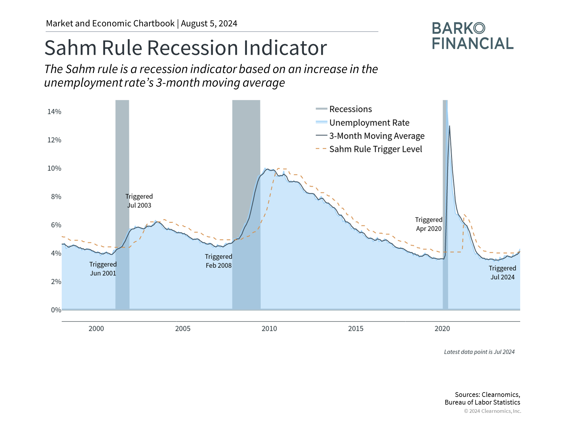 The jobs report for July has officially triggered the Sahm rule, suggesting that the current unemployment rate is consistent with the historical pattern of recessions. However, it’s important to keep in mind that immigration and higher labor force participation, both positive factors, were key drivers in rising unemployment. Additionally, Sahm herself has stated that this is more of a “historical regularity” and not a hard-and-fast physical law. In other words, with unemployment still near historic lows, a rise in unemployment to 4.3% should be watched carefully but does not necessarily mean a recession is imminent.