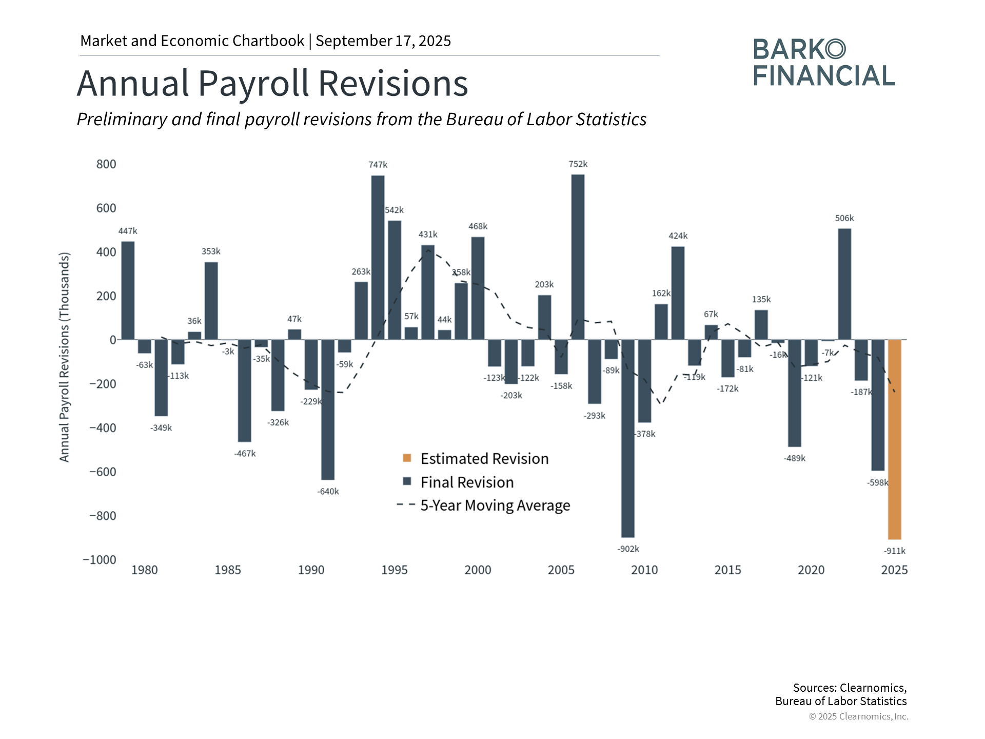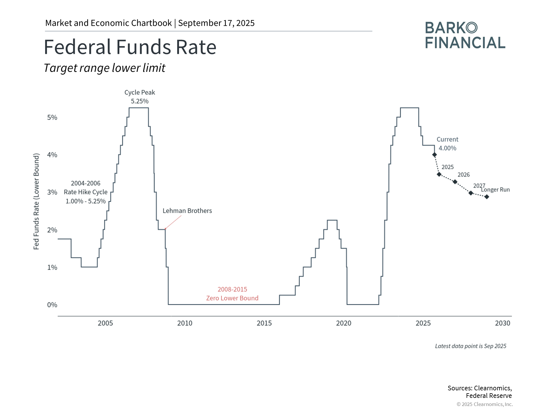 A primary driver of the Fed's decision was softening in the labor market. The economy added only 22,000 jobs in August, well below expectations, and previous months’ numbers were revised down significantly. The unemployment rate only ticked up to 4.3%, however, due to fewer workers seeking jobs. Once again, this is different from past emergency rate cut periods. During the 2008 financial crisis, unemployment spiked from 5.0% to 10.0% and in 2020, it jumped from 3.5% to 14.8%. Today, the jobs numbers suggest a more gradual cooling that may reflect a softening of labor market conditions. Adding to concerns about labor market weakening, recent payroll revisions have painted a more subdued picture of recent job growth than previous data indicated. The Bureau of Labor Statistics' annual revision process showed 911,000 fewer new jobs were created from March 2024 to March 2025, suggesting the labor market was cooling more rapidly than policymakers realized when making earlier monetary policy decisions. These are preliminary estimates that will be finalized in early 2026. While a weakening labor market would support lowering interest rates, the Fed’s concerns around inflation support keeping rates steady, or even raising them if tariffs drive prices higher. The Fed’s preferred inflation gauge, the Personal Consumption Expenditures (PCE) Price Index, at 2.6%, remains well above the 2% target. Core PCE is hovering at 2.9%, while headline and core CPI have remained sticky at 2.9% and 3.1%, respectively. Earlier progress on inflation has not only slowed, but some of the trends have reversed in recent months. The Fed’s job is to balance these factors as part of its “dual mandate.” The mixed signals these indicators are sending explain why there is disagreement both within the Fed and with the White House. For investors, understanding these trends will likely be more helpful in understanding the economic and interest rate environment than watching the day-to-day political headlines. Rate cuts generally benefit businesses and investors For investors, the critical distinction is whether rate cuts coincide with recession or support continued expansion. While there are some signs of economic weakness, there are not yet signs of a recession. In these situations, rate cuts typically provide broad benefits across financial markets. Lower borrowing costs make it cheaper for companies to finance growth and reduce debt service expenses. Consumer spending can increase if mortgage and credit card rates decline, boosting demand for goods and services. One concern with rate cuts today is that the stock market is already near all-time highs. While this is not typical, there have been historical cases during which this occurred. For example, under Alan Greenspan, the Fed cut rates three times in 1995 and 1996, calling the cuts "insurance" against economic slowdown. The Fed also made cuts in 2019 at market highs to address global growth concerns. At the latest press conference, Powell described this most recent policy decision as "a risk management cut" due to the Fed’s view that “downside risks to employment have risen.” For portfolios, history shows that the effects of rate cuts are generally positive across asset classes. While the past is no guarantee of the future, stocks typically benefit as lower rates reduce the discount rate for future earnings and improve corporate profitability, especially among growth-oriented businesses. Meanwhile, bonds typically become more valuable due to their higher rates, although this can vary across bond sectors and maturities. In contrast, cash will likely experience lower yields, making it even less attractive compared to investments like stocks and bonds. While each economic cycle is unique, navigating policy change is a normal part of investing. Importantly, rate cuts are generally supportive for long-term investors, although balancing risk and reward requires a broad understanding of market trends. The bottom line? The Fed's latest rate cut may support the economy amid mixed signals. Investors should maintain a long-term perspective, focusing on the overall market direction rather than individual Fed decisions. | ||