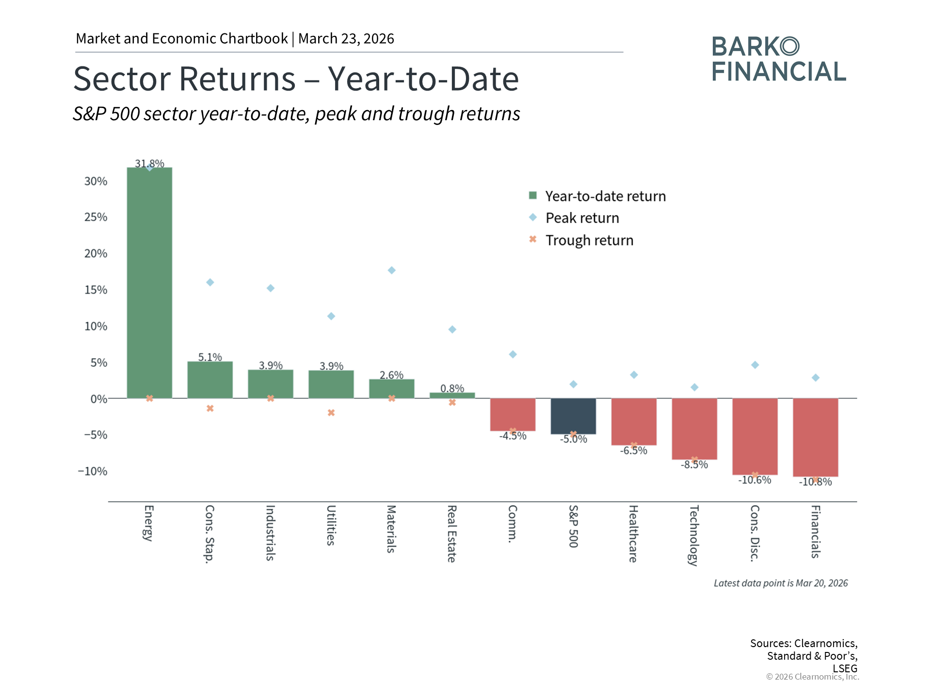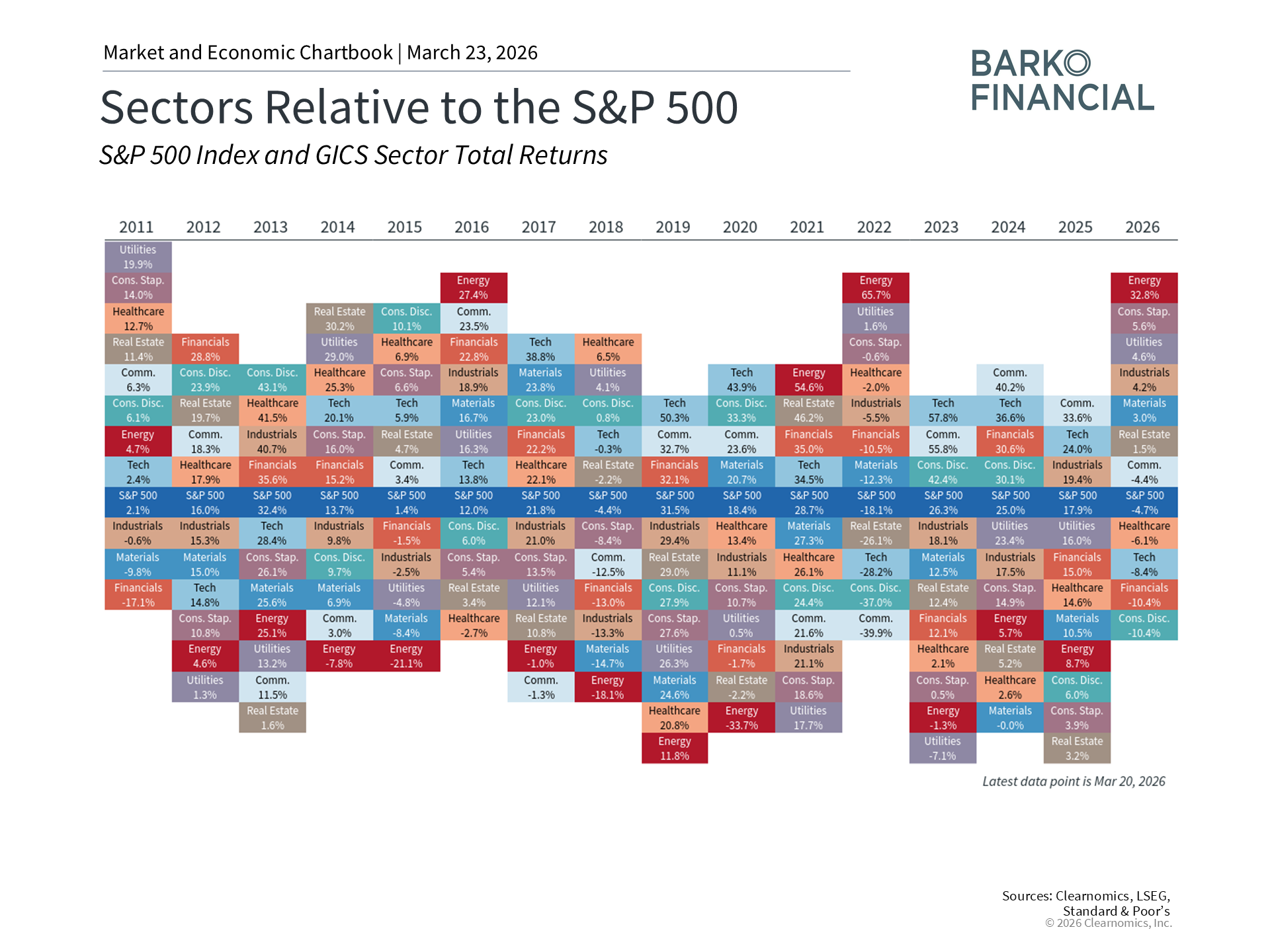 When investors think about the stock market, they tend to focus on broad indices like the S&P 500 or Dow Jones Industrial Average. While this is a natural starting point, it’s often helpful to look one level deeper at the sectors within each index. For instance, the 11 sectors that make up the S&P 500 each have unique characteristics and can behave differently based on economic conditions and geopolitical developments. Understanding these dynamics is important for portfolio construction, diversification, and long-term financial planning. In today's environment, the difference between the best and worst performing sectors has widened to over 40 percentage points this year. This is a significant development driven by the ongoing conflict in the Middle East, oil price swings, and the evolving narrative around AI. At the moment, the S&P 500 also experienced its first pullback of more than 5% from its all-time high, even though 6 of the 11 sectors are positive so far this year. This is possible because the S&P 500 index does not weigh all sectors equally, with Technology currently making up nearly one-third of the index, compared to Energy and Utilities at just 3.5% and 2.5% respectively. Of course, while the past is no guarantee of the future, history also shows that conditions can change quickly and the market can recover, often when it’s least expected. While the market dynamics of the past few months are impactful, the reality is that there is unique sector-level behavior every year. Taking a longer-term view, many sectors have performed well over the past few years, often in ways that surprised investors. This is a reminder that maintaining balance across sectors matters as much as doing so across asset classes. So, what perspective is needed to understand the recent sector rotation and market pullback? The energy sector has surged amid geopolitical uncertainty