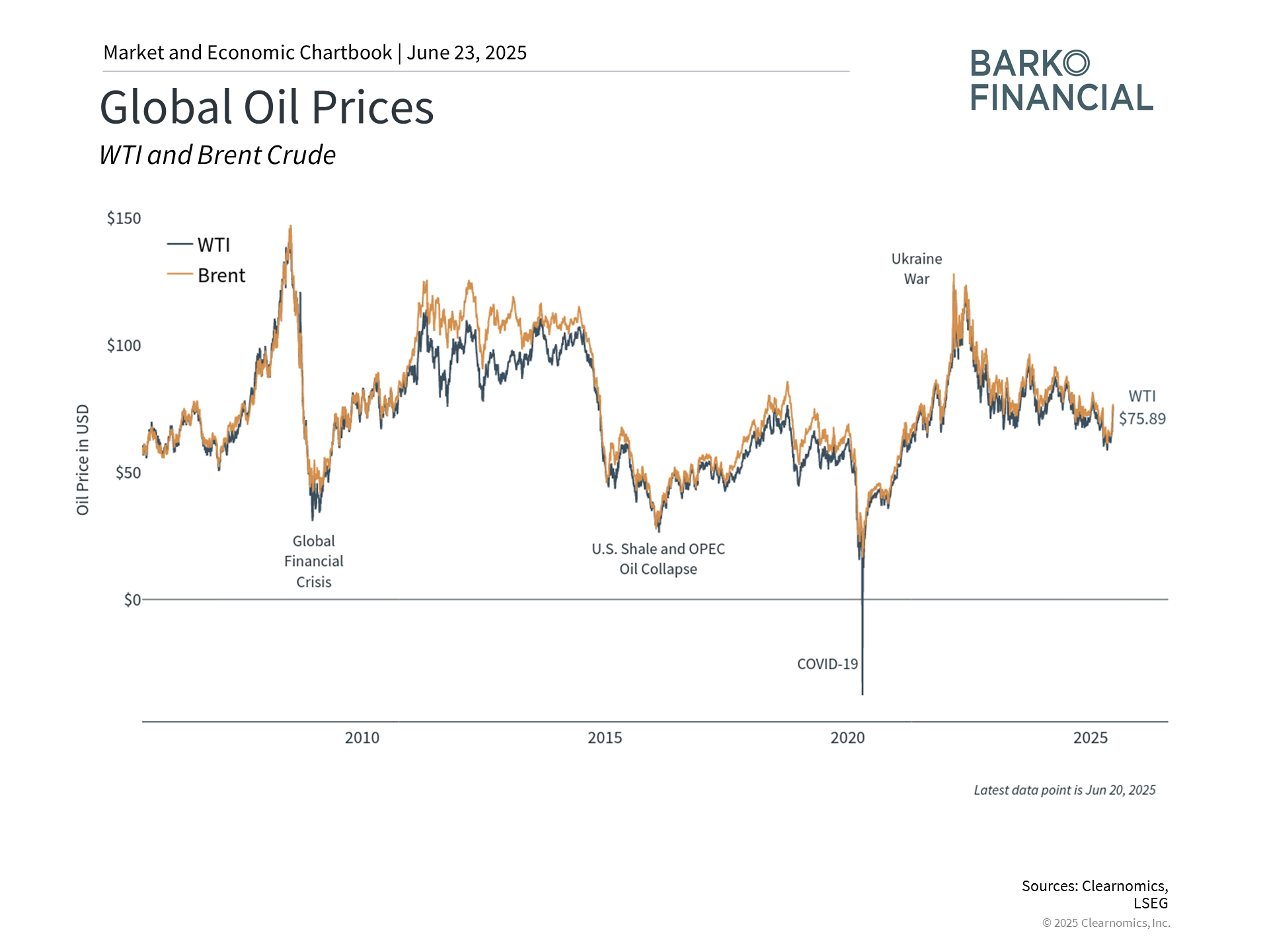 Nevertheless, maintaining perspective on current oil price levels remains important. While recent volatility is noteworthy, prices stay well below 2022 peaks during the early Russia-Ukraine conflict period, when oil exceeded $120 per barrel. Current mid-$70s levels fall within ranges experienced in recent years. This year alone, oil prices have varied between $60 and $82 per barrel.
