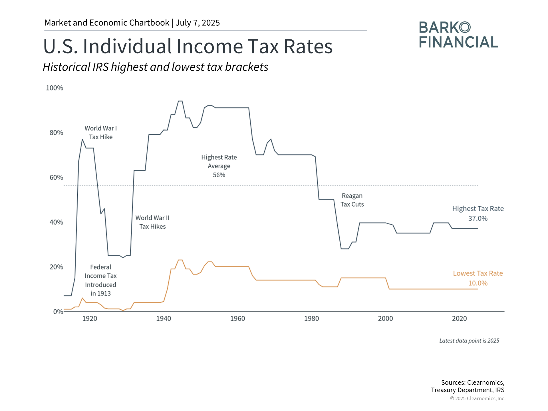 These modifications and others preserve the relatively favorable tax climate that has defined recent decades. The accompanying chart demonstrates that current rates remain significantly below 20th century peaks, when top marginal rates exceeded 70% and occasionally surpassed 90% during wartime.