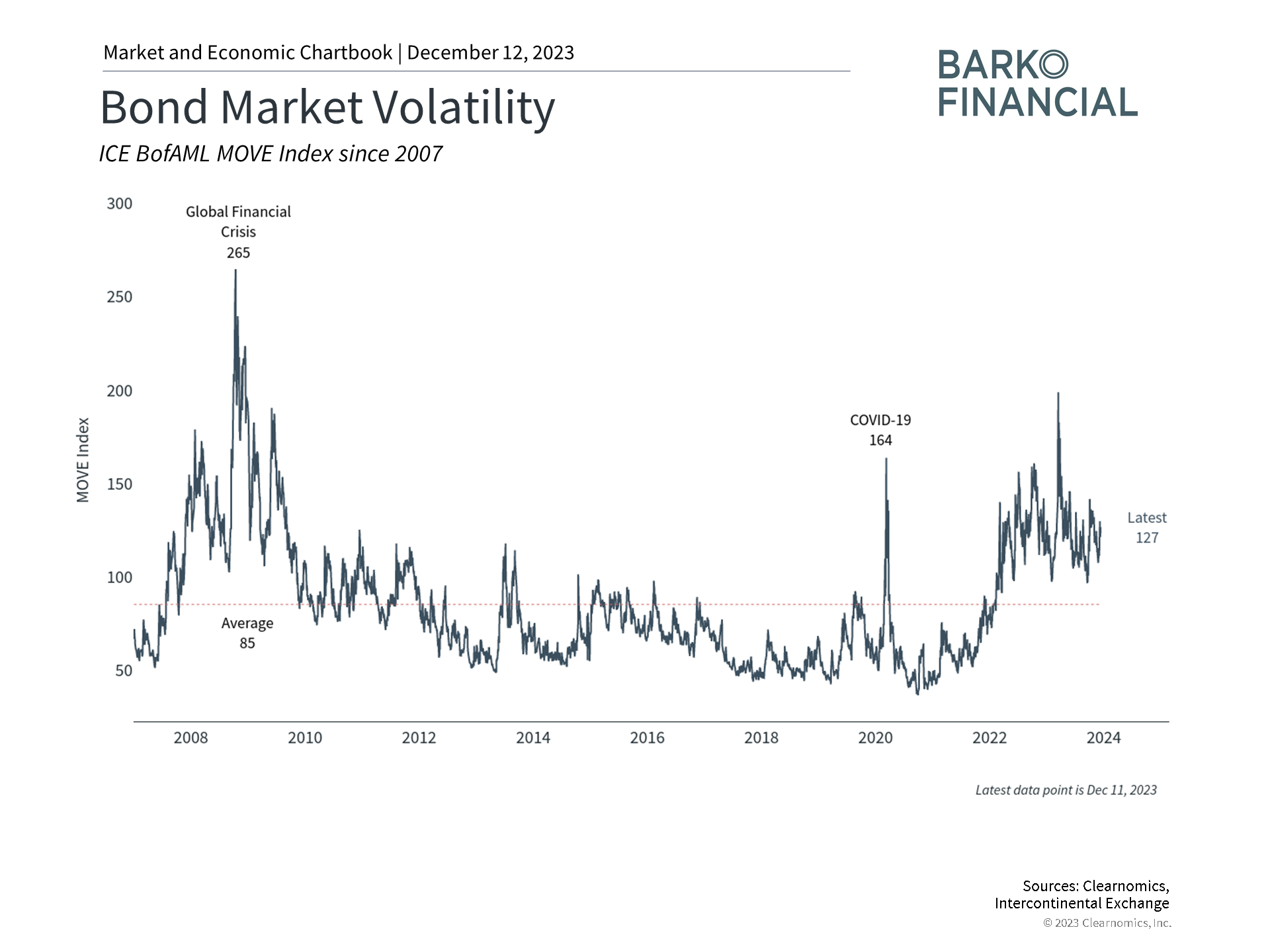 Bond market volatility has remained elevated this year due to the banking crisis and the rate jump that began in late summer. Both the level and change in rates impact the prices and returns of the bond market, affecting portfolio returns.