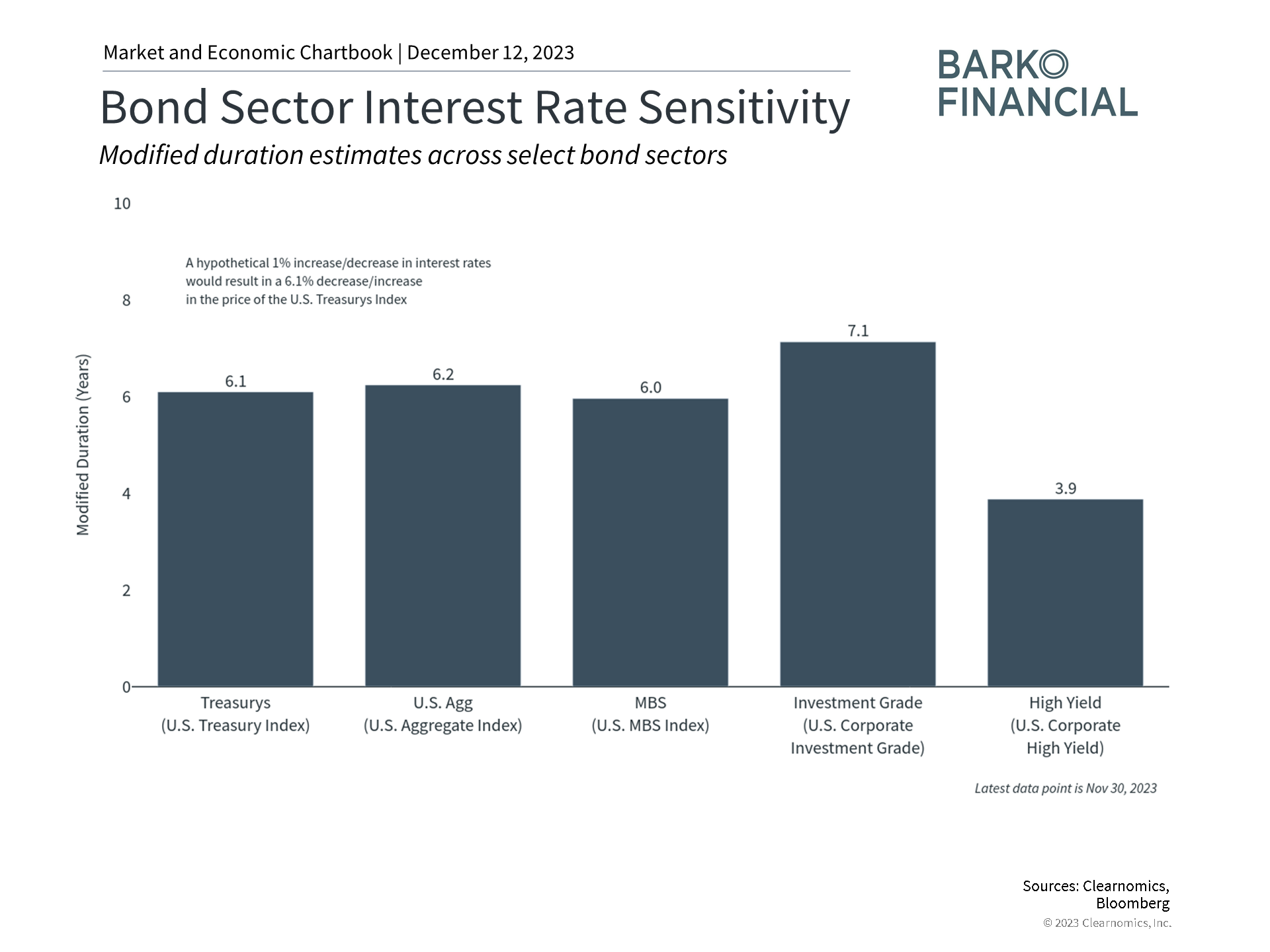 So, while the jump in interest rates over the past two years has raised questions for some asset allocation strategies, the bond market reaction is easy to understand. These concepts suggest that more stable rates would be a welcome sign for investors and could help to reestablish bonds as portfolio stabilizers. Since duration calculations go in both directions, bond prices could benefit if rates were then to decline. The possibility that the Fed could cut rates next year has already supported bond prices and could continue to do so if long-term interest rates begin to ease as well.