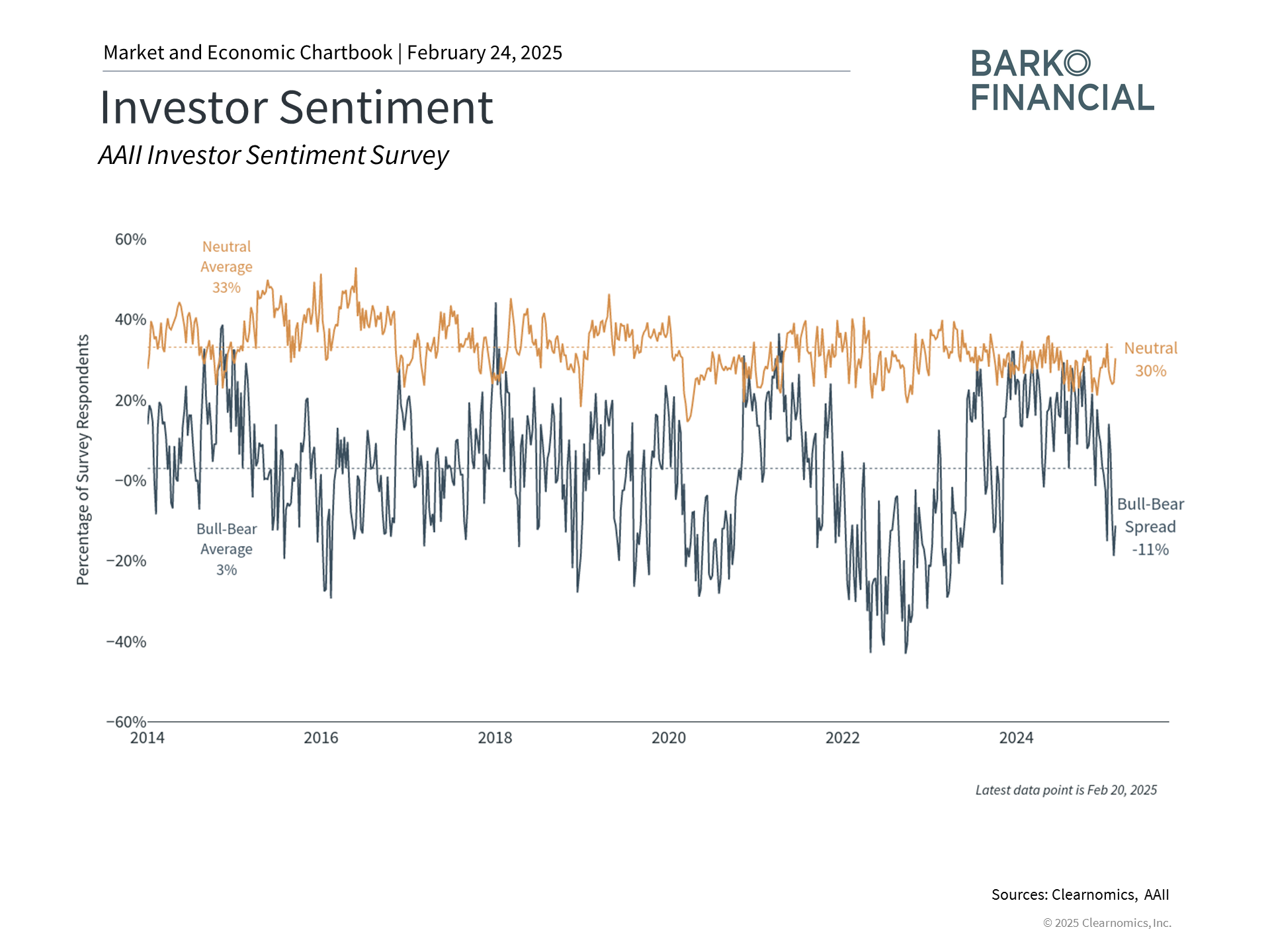 Recent data from the AAII Investor Sentiment Survey reveals a significant bearish tilt, with negative sentiment surpassing positive outlook by up to 19%. This represents the highest level of pessimism since the recession fears of late 2023. The data demonstrates how rapidly investor attitudes can shift.